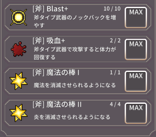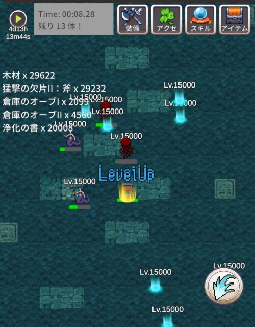 ボス戦はノックバックのために金斧に木の短剣10で幸運をつけた状態でした。