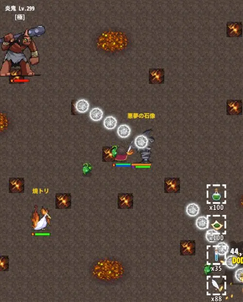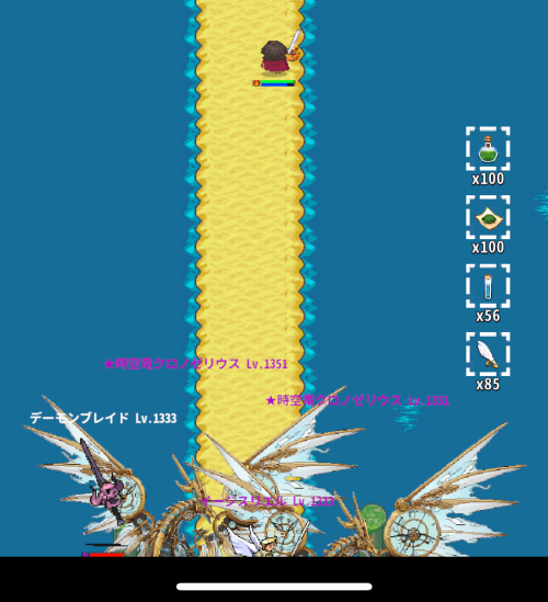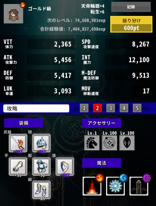 このステータスで、道中はデーモンブレイド以外は物理で倒せるので、周回難易度は低めです。